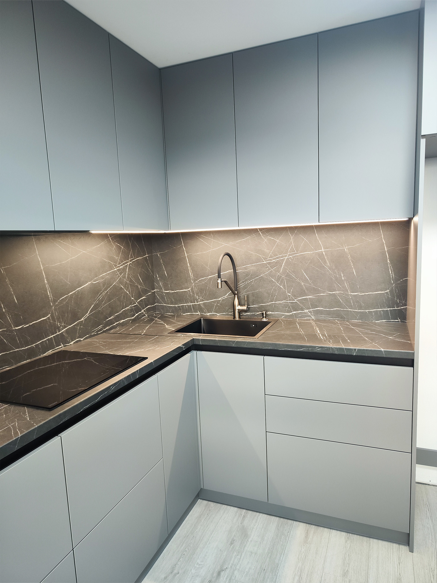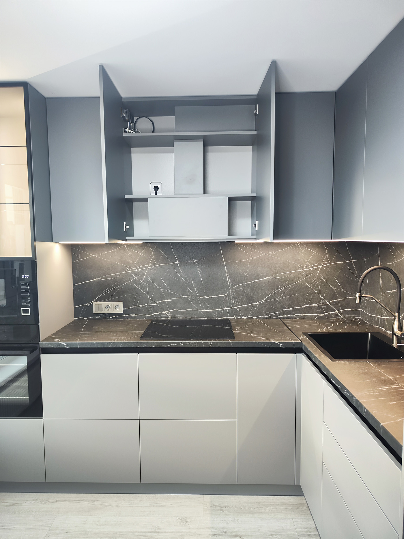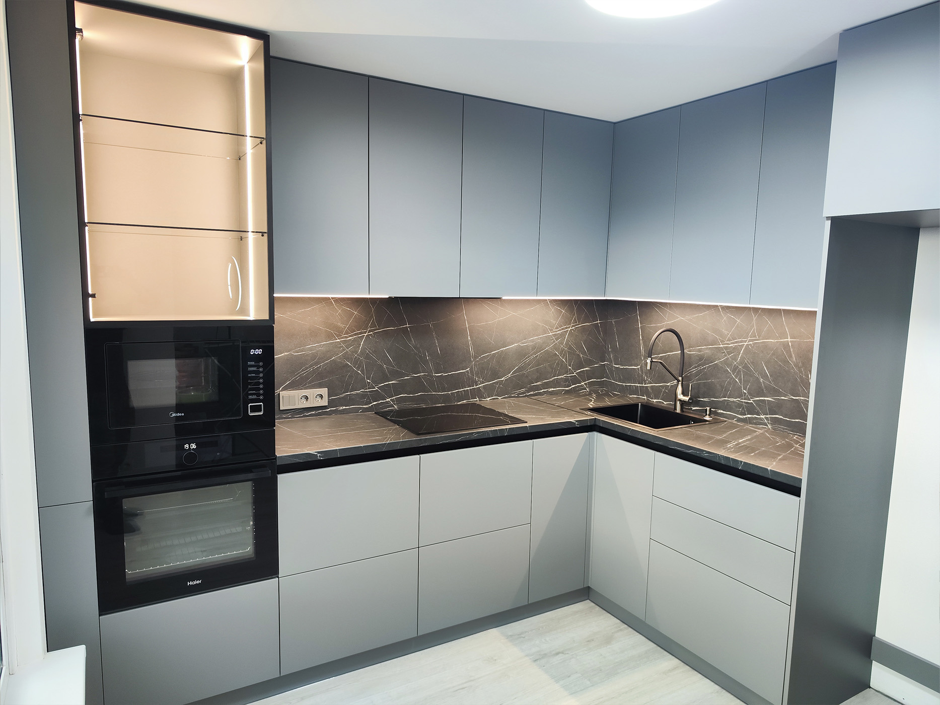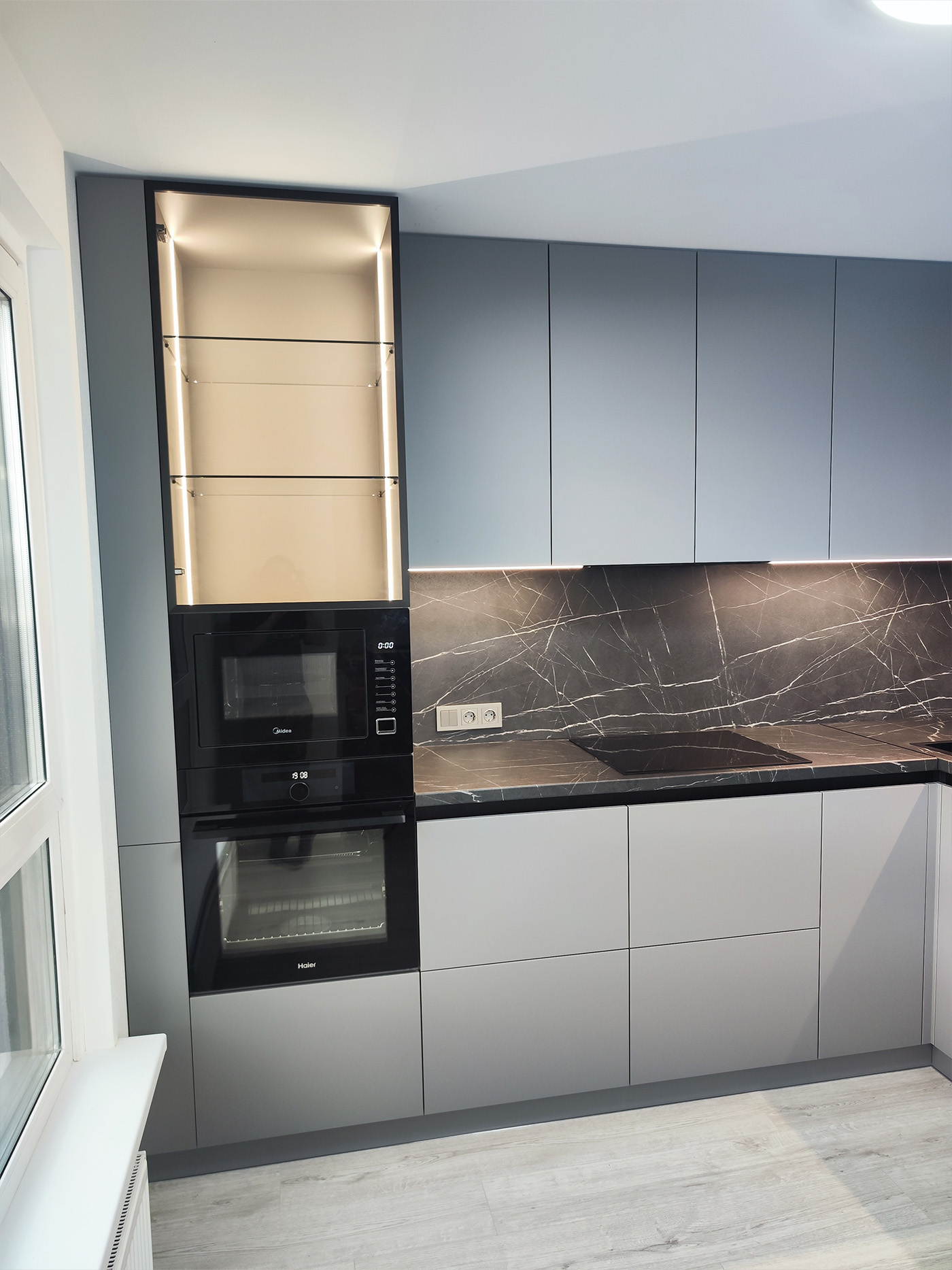 Кухня в современном стиле, фасады B.MATT-05, скинали и столешница постформинг Egger Камень Пьетра Гриджиа чёрный, Gola профиль, витрина с полками из закаленного прозрачного стекла, врезная подсветка, фурнитура Blum: