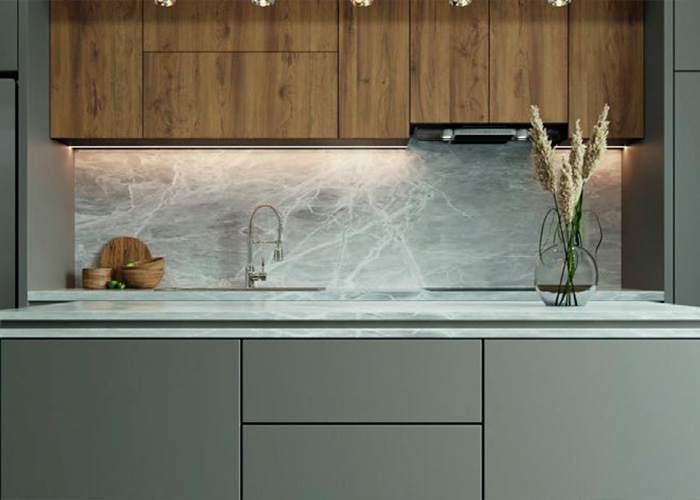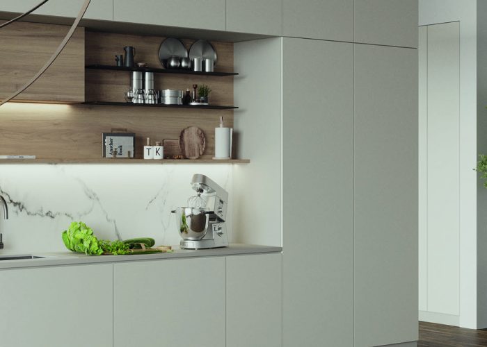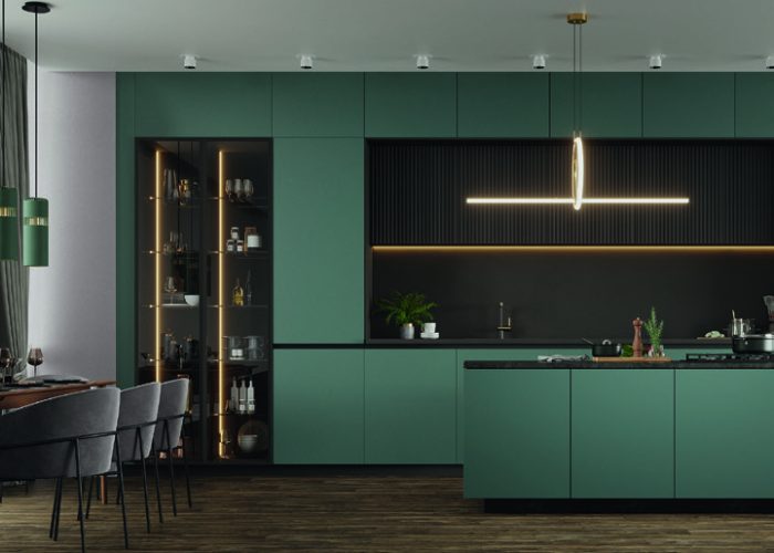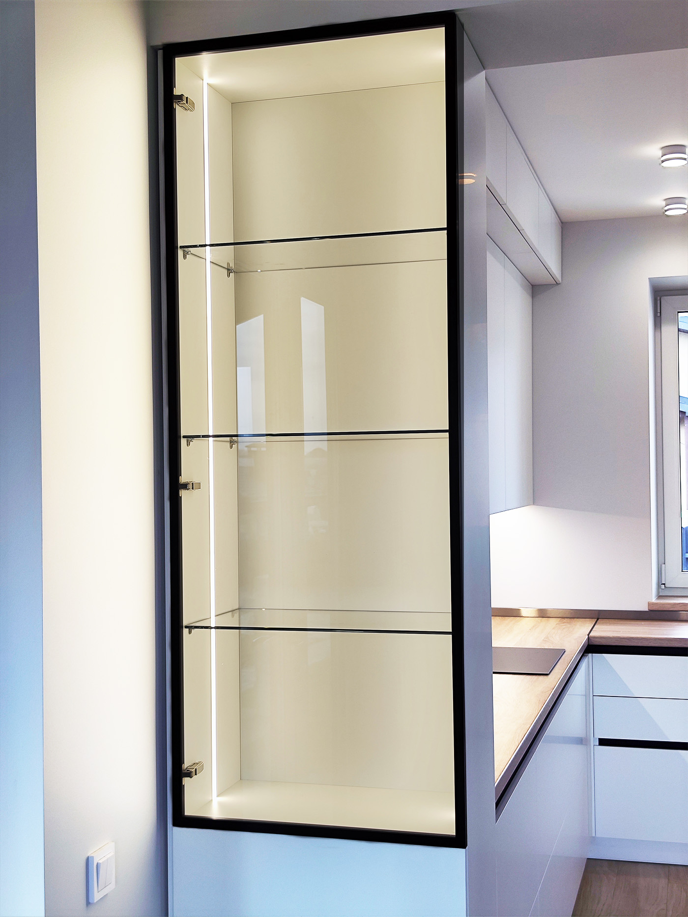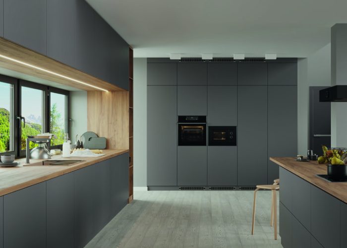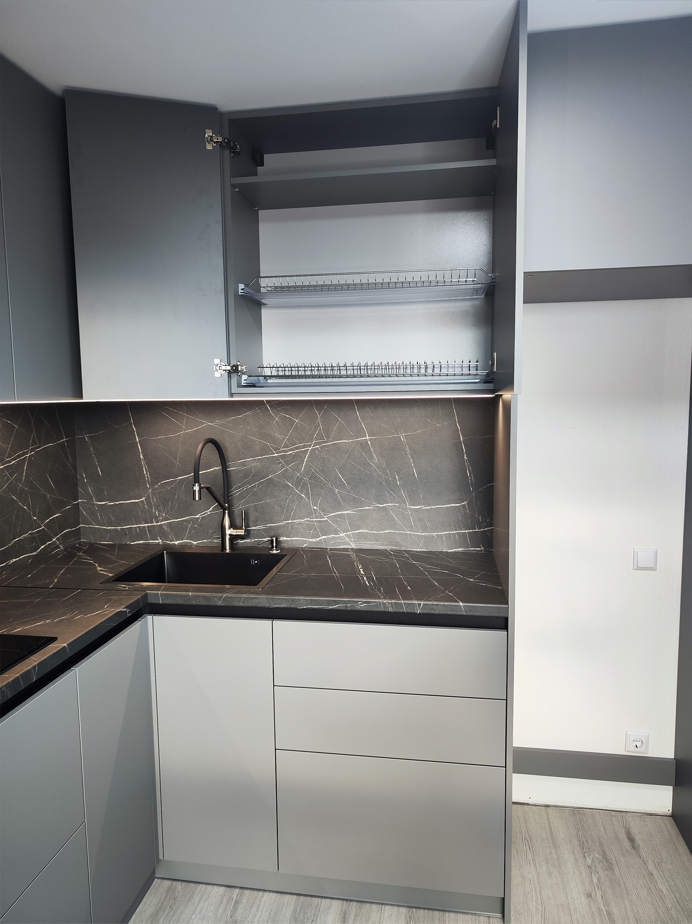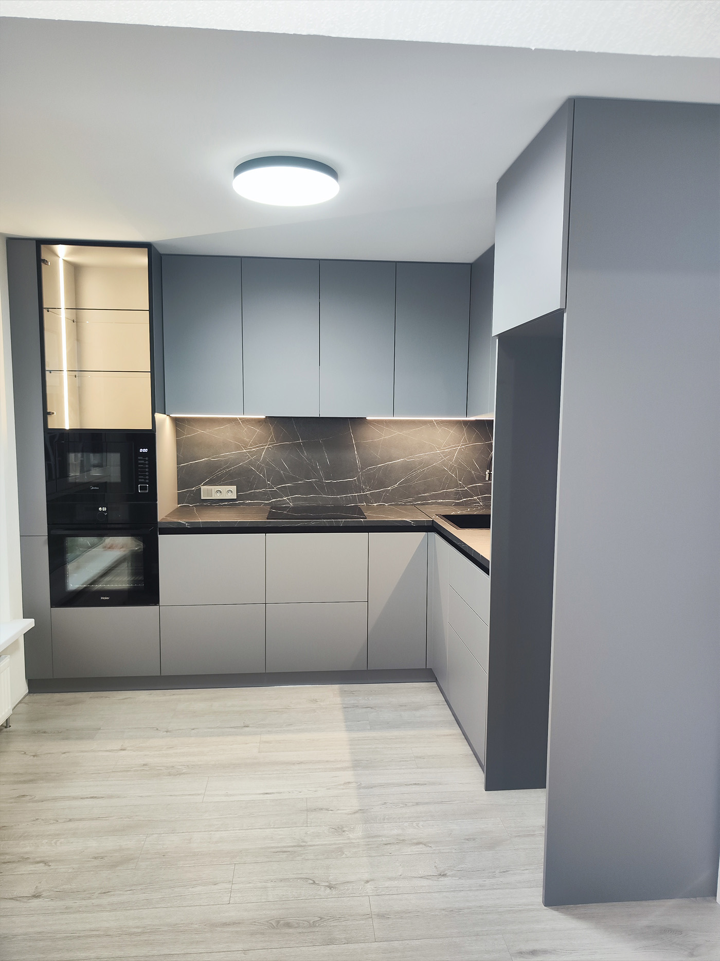 Кухня в современном стиле, фасады B.MATT-05, скинали и столешница постформинг Egger Камень Пьетра Гриджиа чёрный, Gola профиль, витрина с полками из закаленного прозрачного стекла, врезная подсветка, фурнитура Blum: