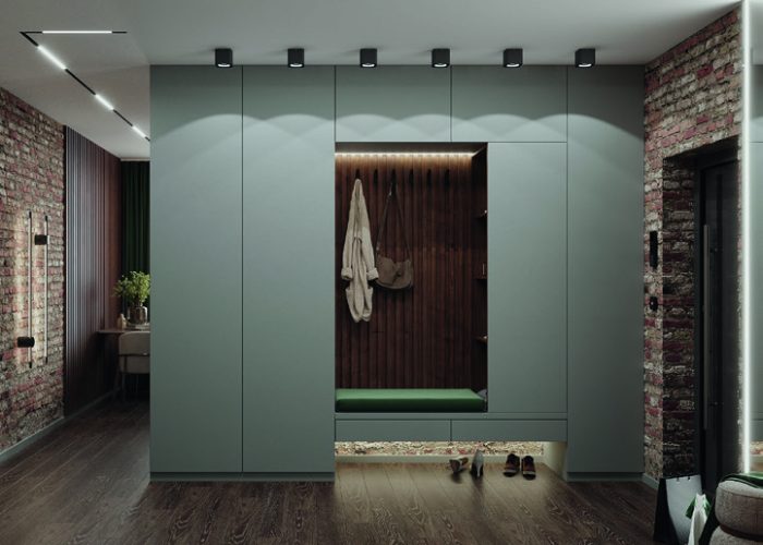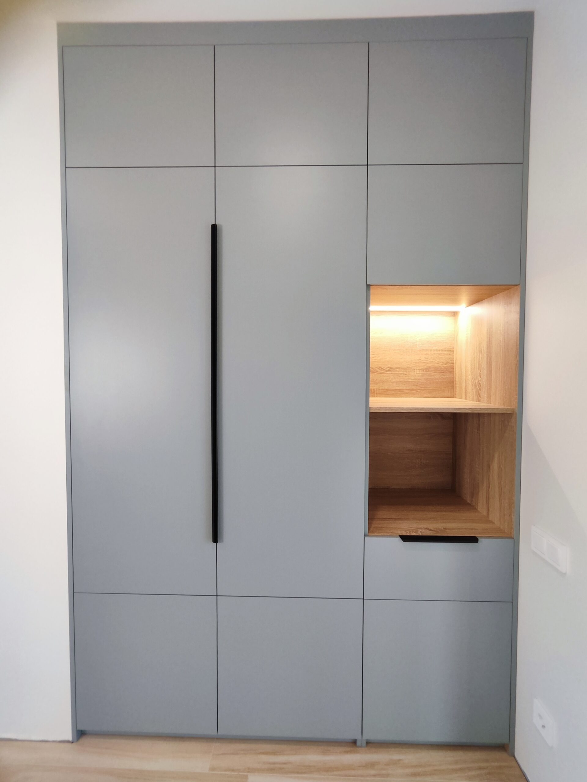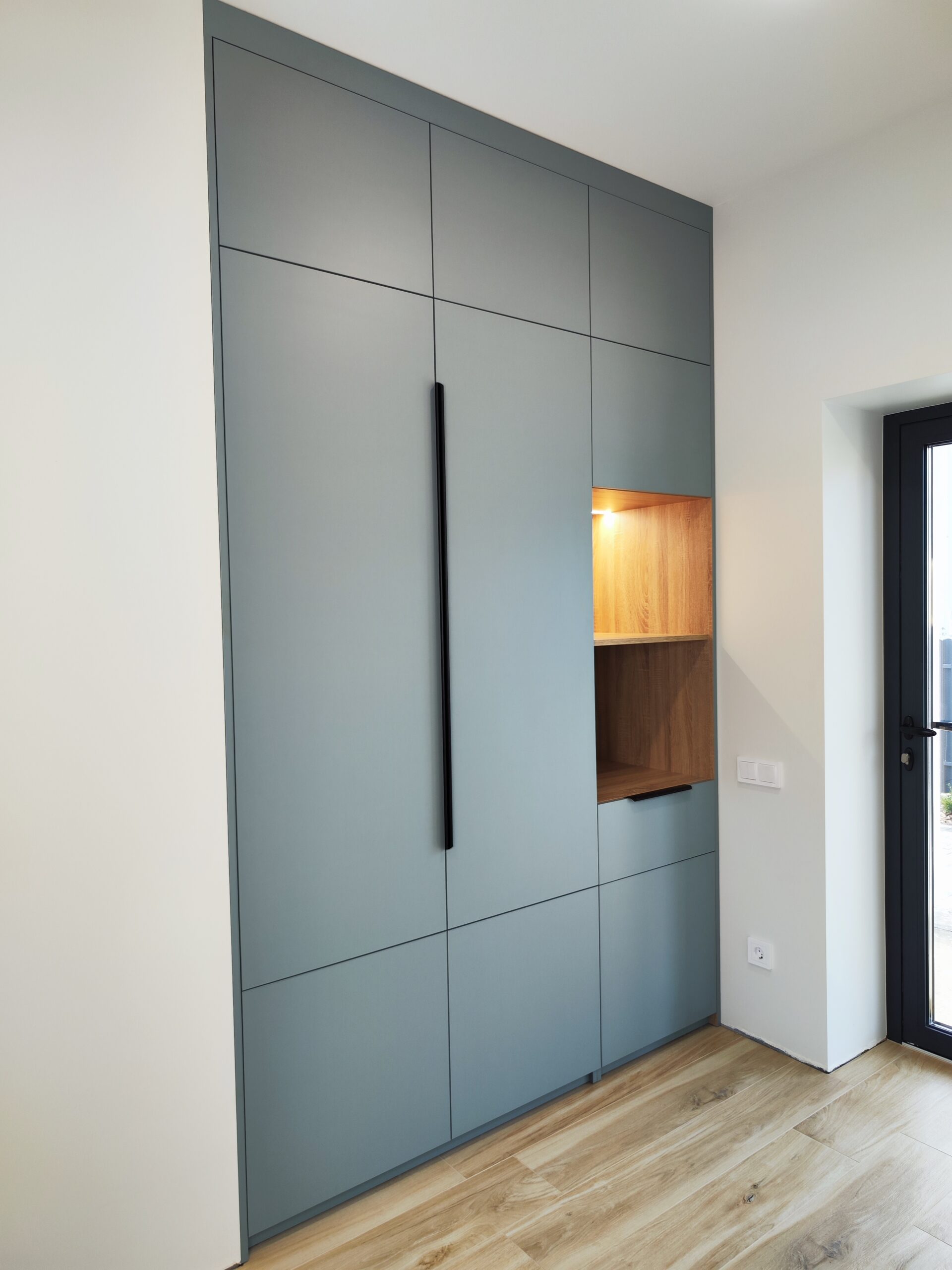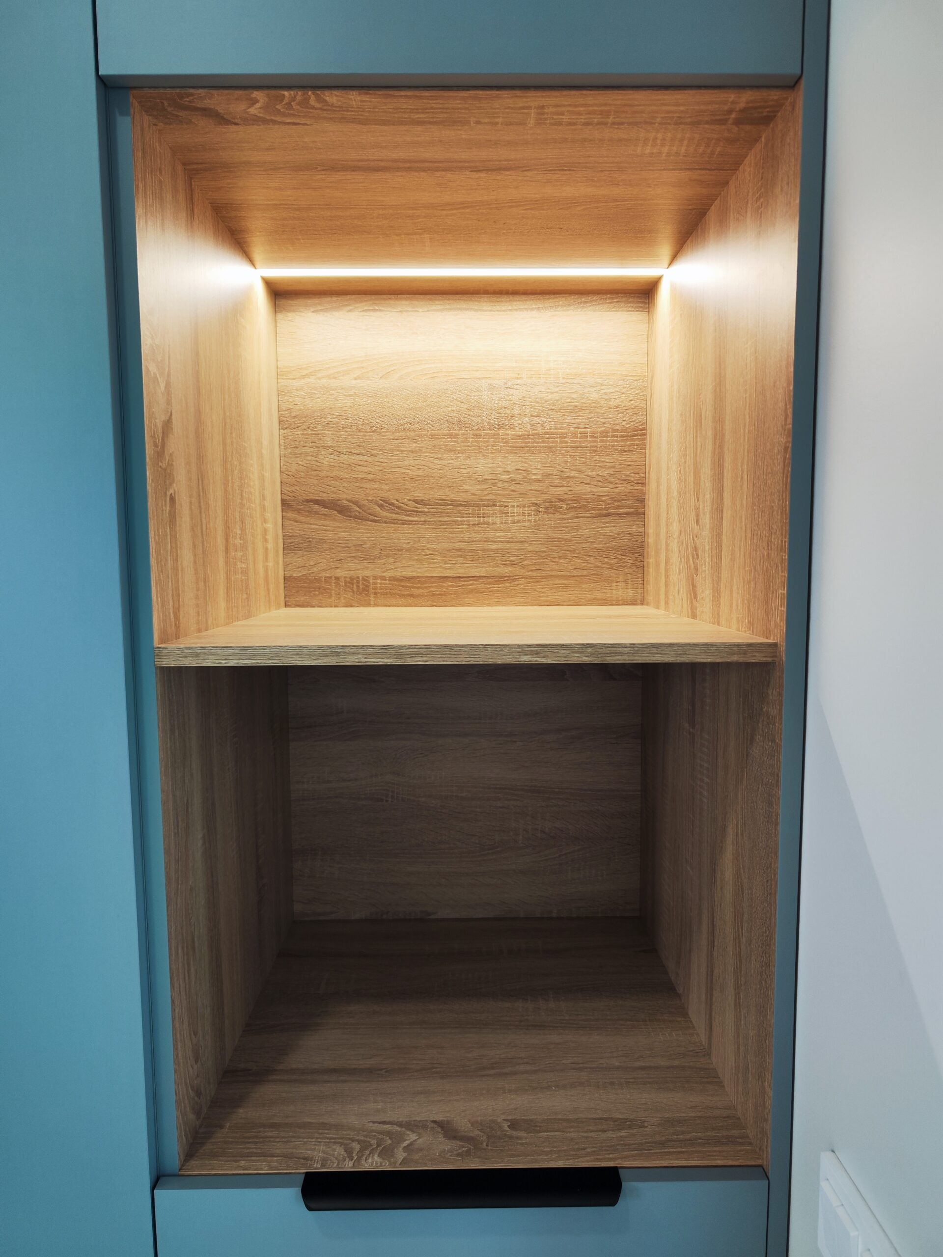 Встроенный шкаф, фасады ЛДСП EGGER Фьёрд, врезная подсветка, фурнитура Blum: