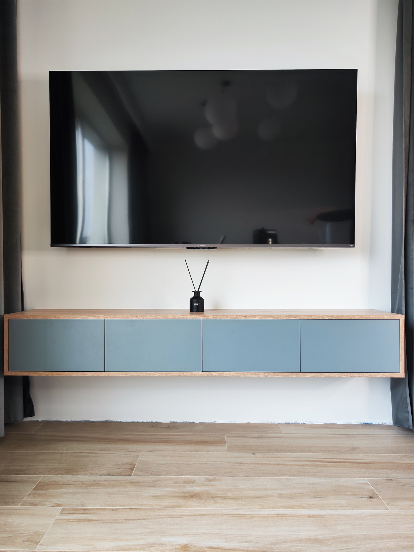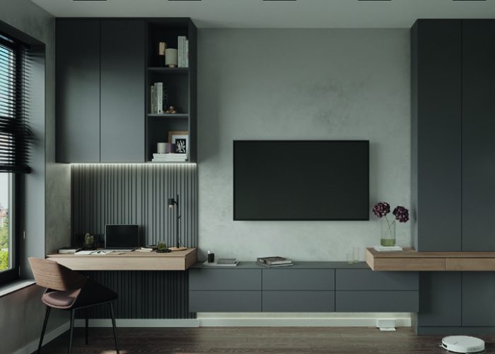 Мебель в гостиную и кабинет, фасады ЛДСП Эггер Фьёрд, Белый премиум, Серый монументальный, столешница дуб бардолино натуральный, фурнитура Blum: