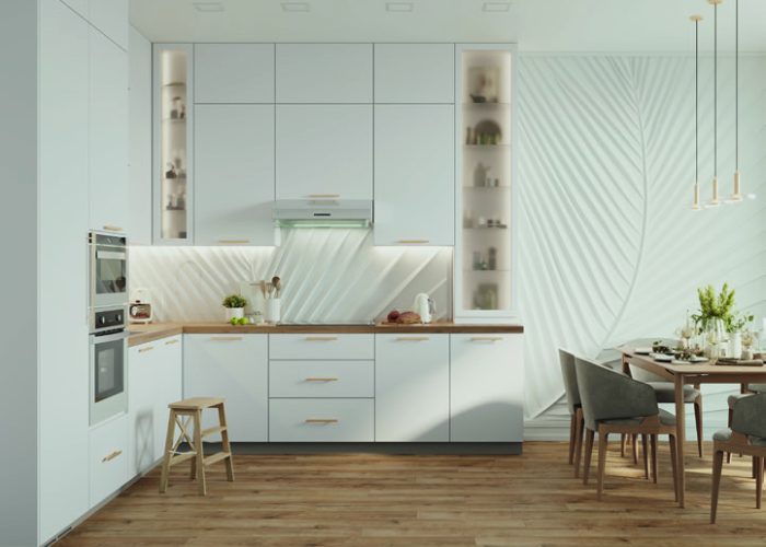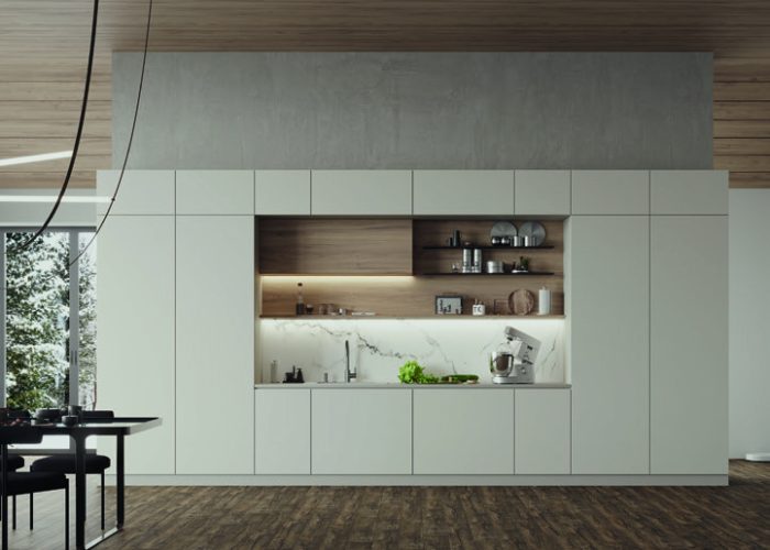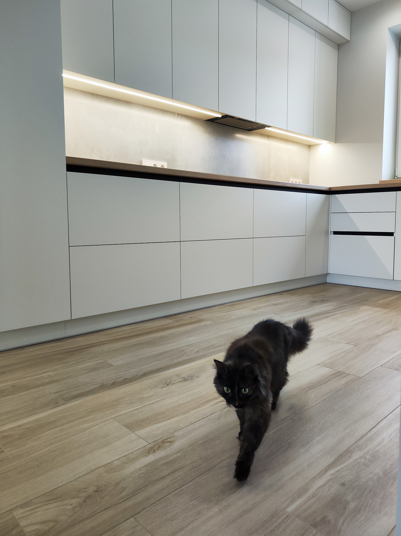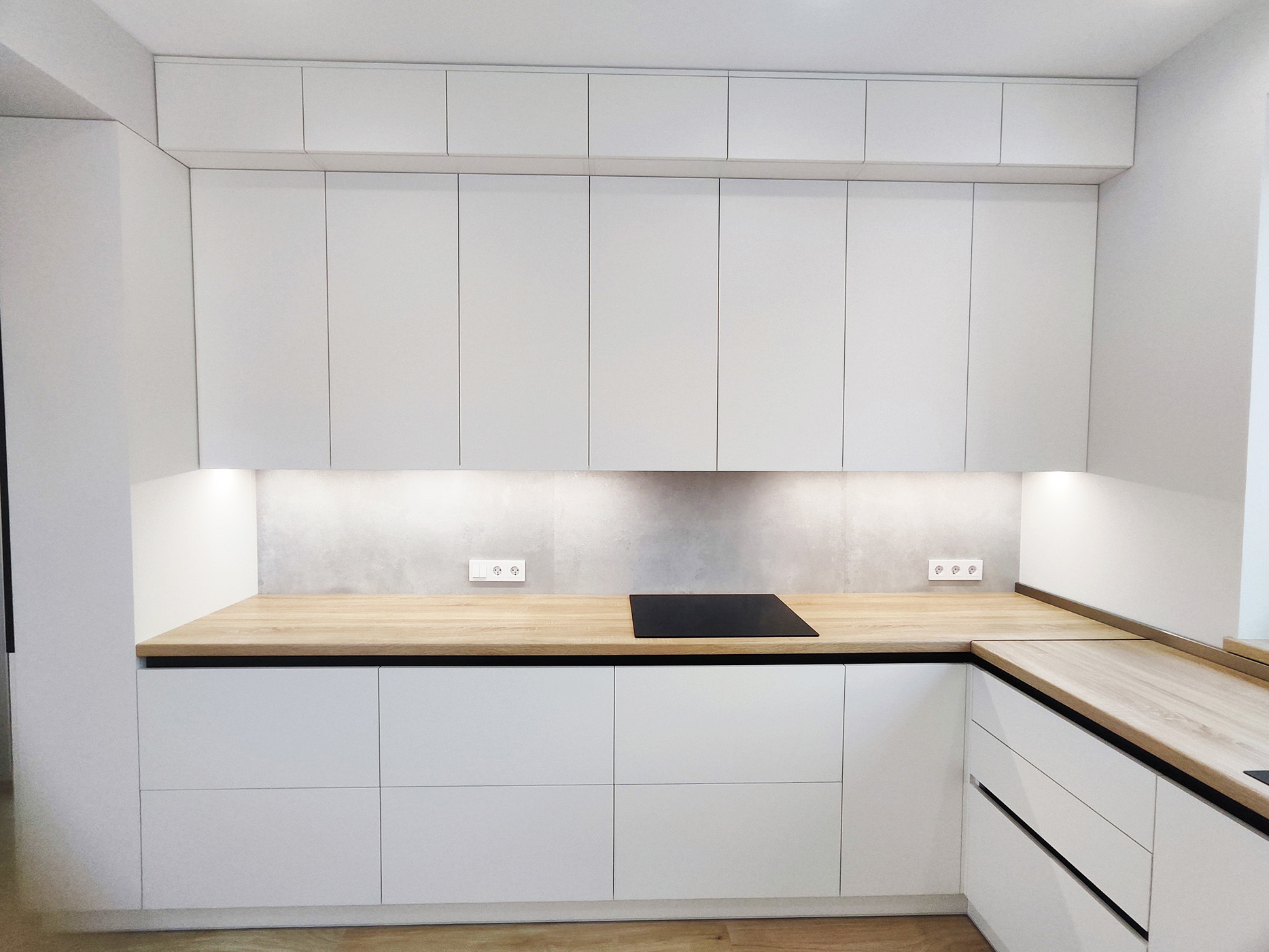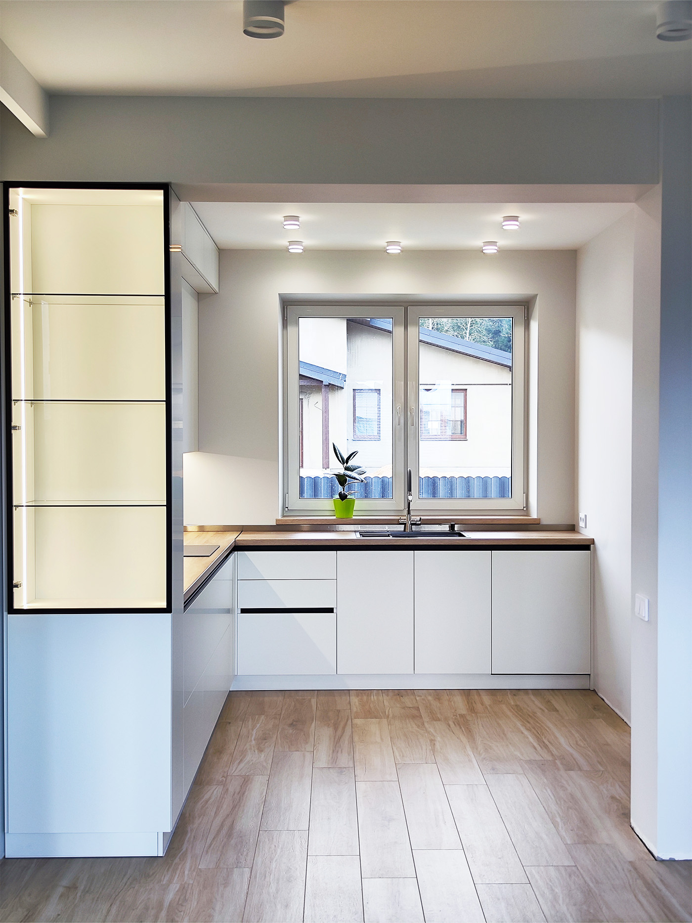 Белая кухня в загородном доме, фасады B.MATT-01, B.MATT-05, столешница постформинг Egger дуб бардолино натуральный, Gola профиль, витрина с полками из закаленного прозрачного стекла, врезная подсветка, фурнитура Blum: