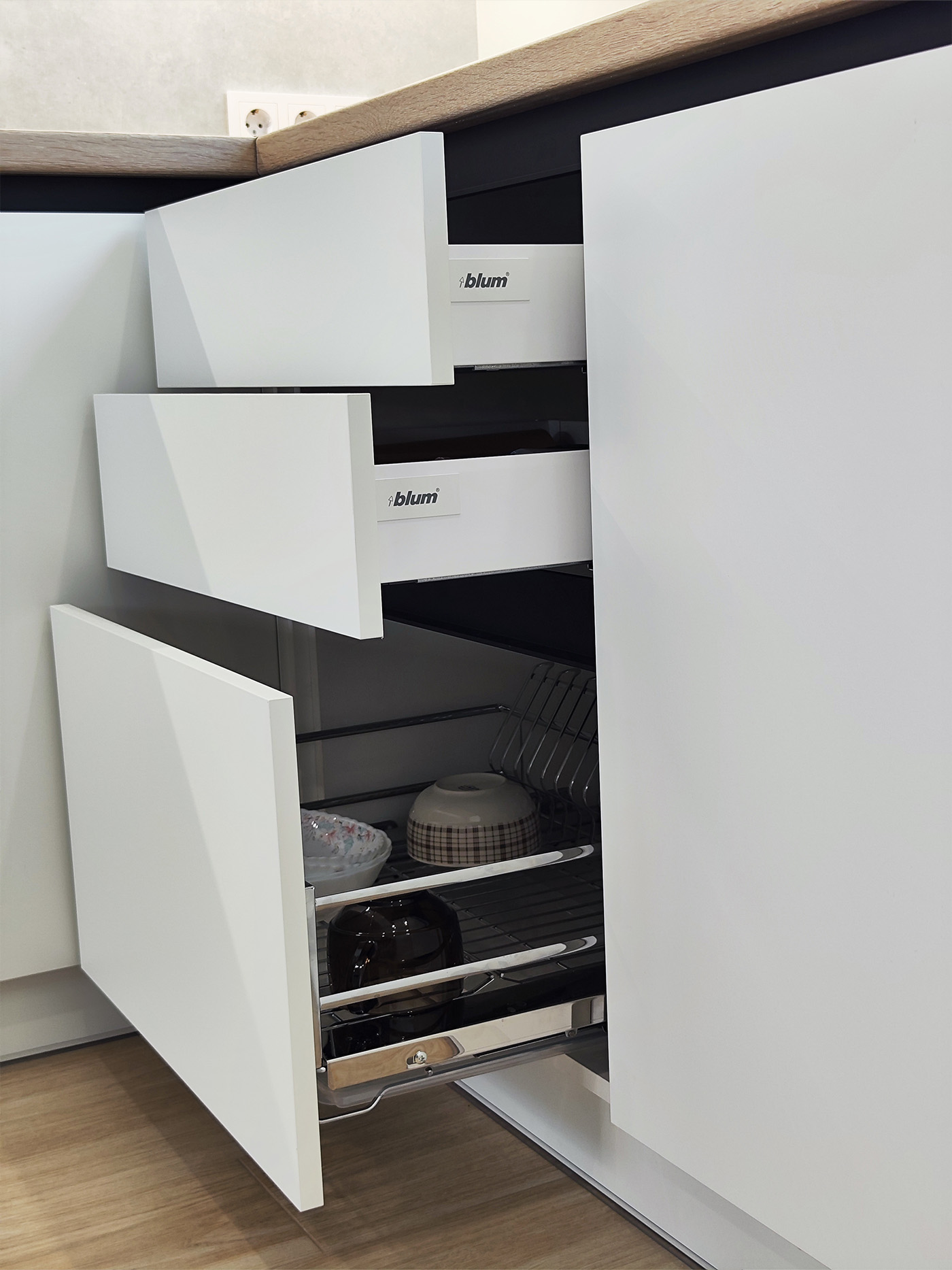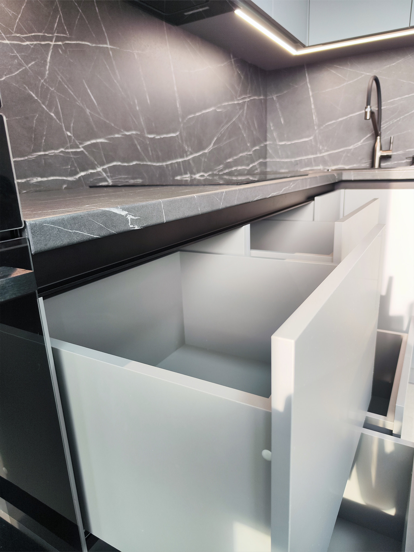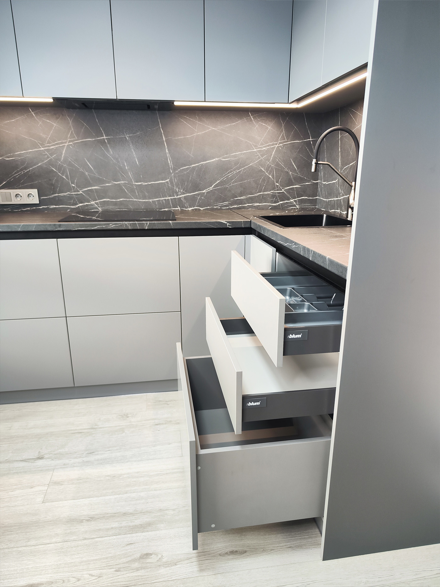 Фурнитуру используем Blum или Hettich. Делаем столешницы из постформинга, компакт плиты либо искусственного камня на ваш выбор.