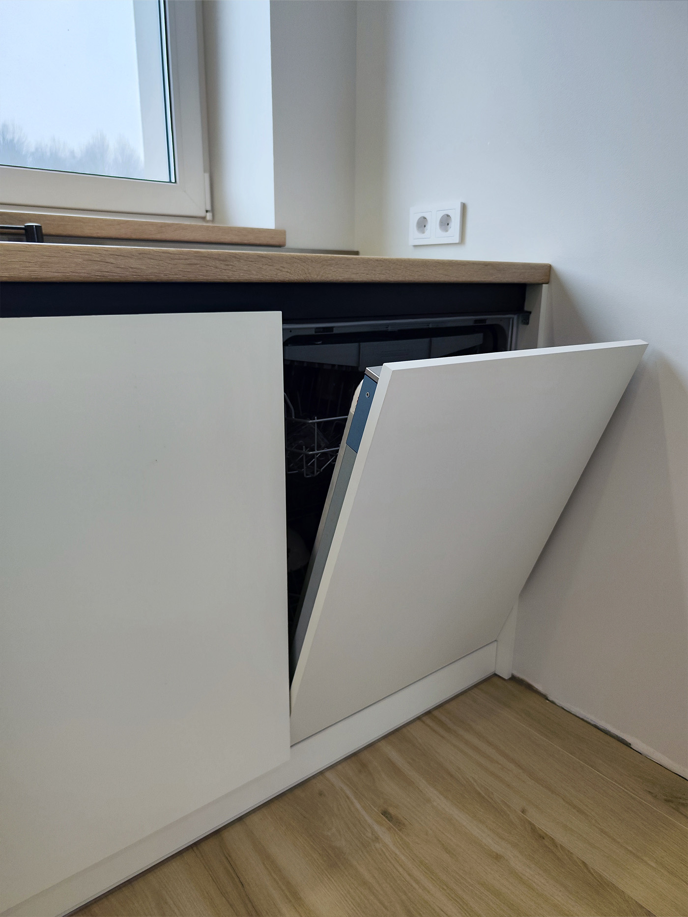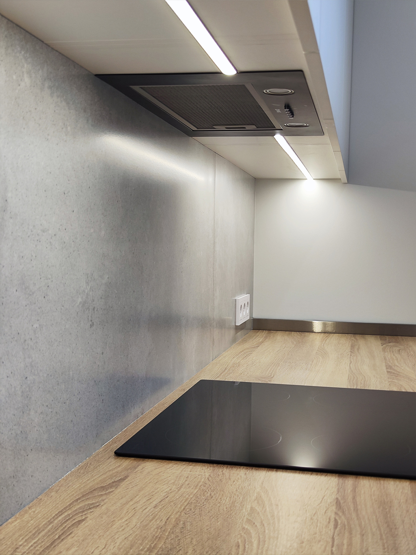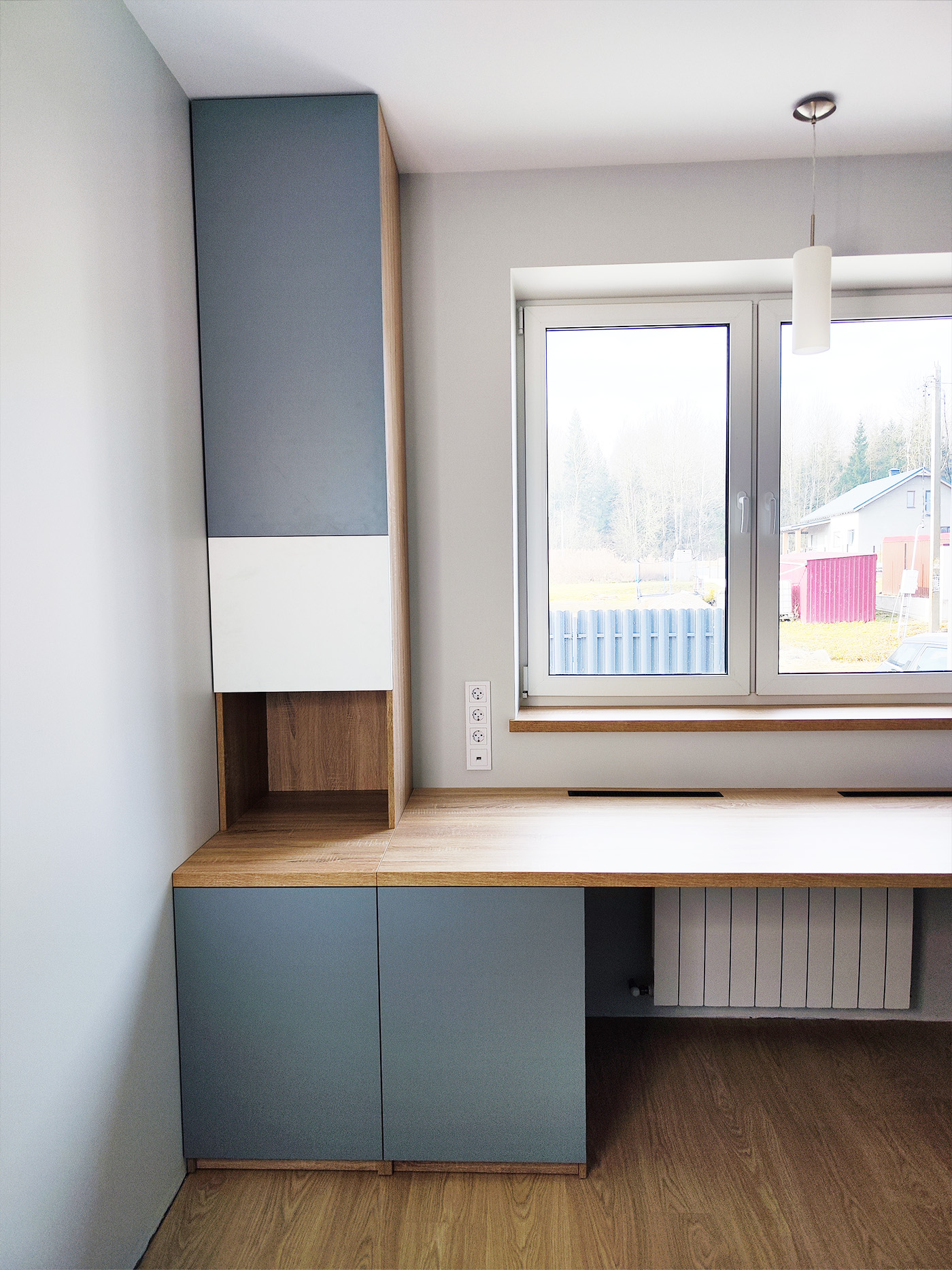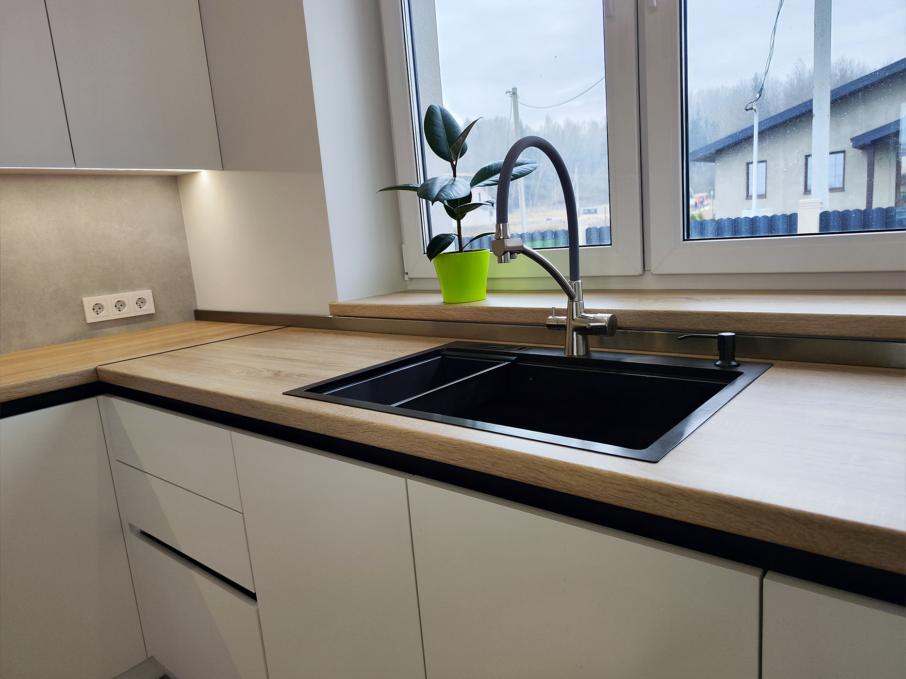 Фурнитуру используем Blum или Hettich. Делаем столешницы из постформинга, компакт плиты либо искусственного камня на ваш выбор.